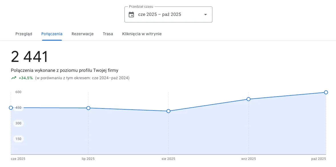 Od czasu naszego wkroczenia w optymalizację wizytówki Google widać znaczącą poprawę liczby telefonów (od sierpnia 2025 r.):
