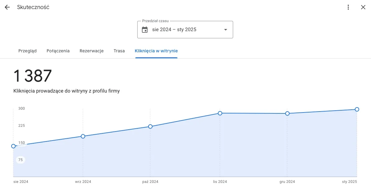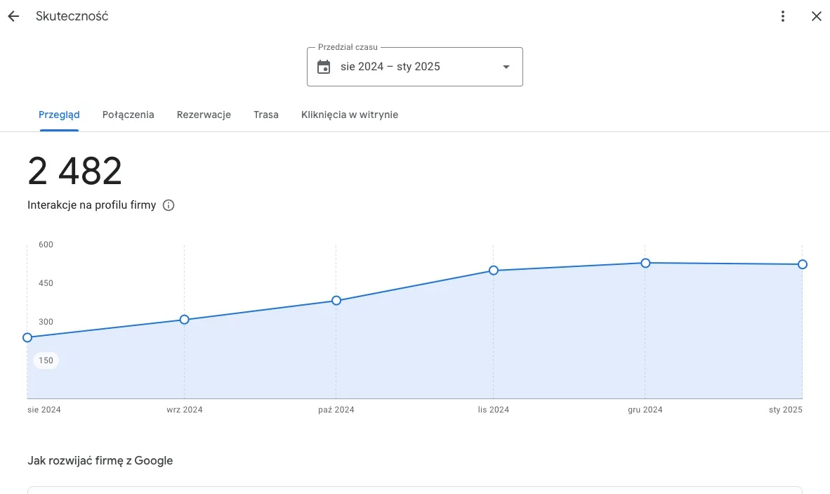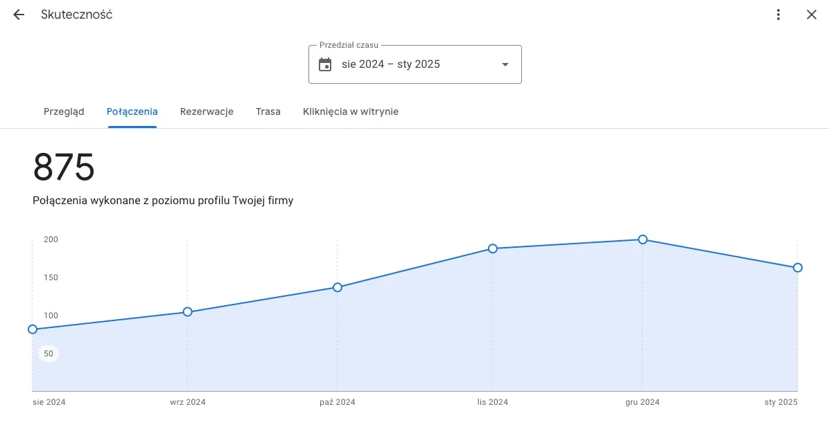 Co najważniejsze, oprócz widoczności naszej wizytówki, mieliśmy również wykonywane ważne zdarzenia na wizytówce. Połączenia oraz wejścia na stronę przez wizytówkę wzrosły.