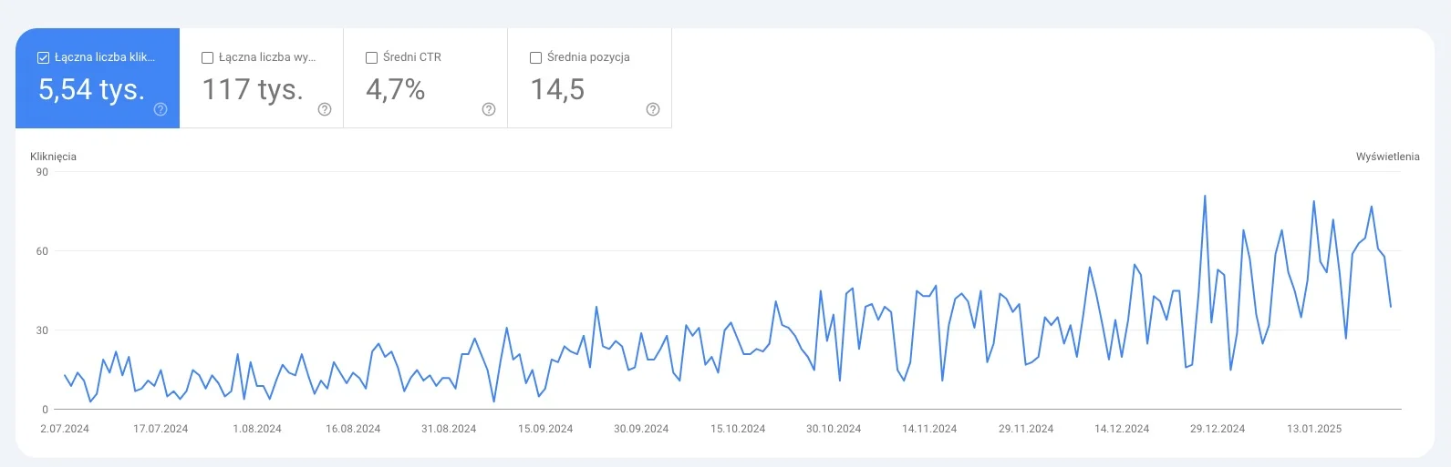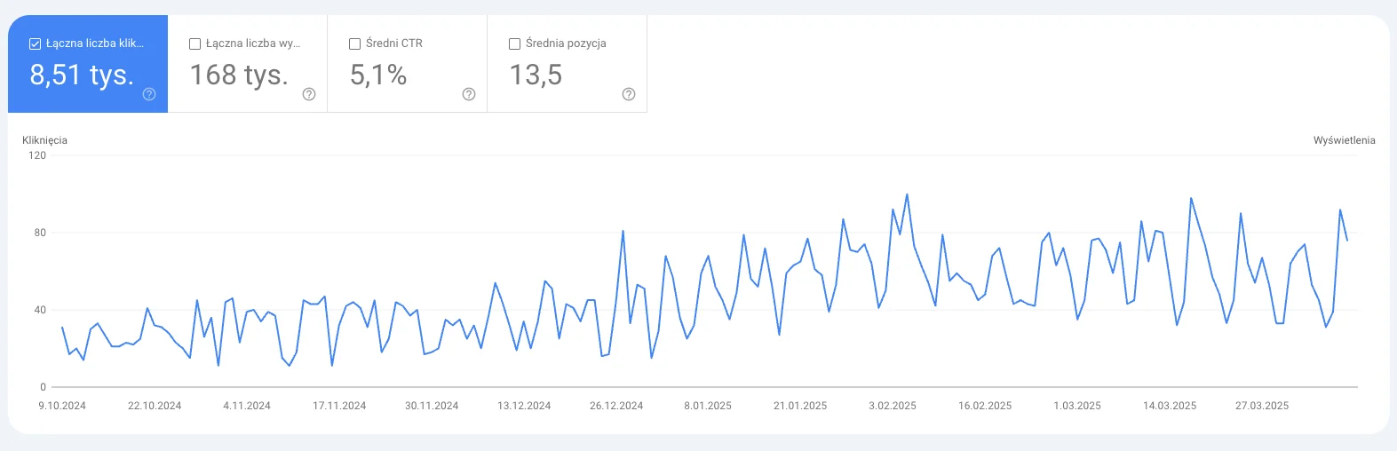 Początek współpracy wiązał się z zintensyfikowaniem naszych działań – na pierwsze trzy miesiące łącznie mieliśmy do dyspozycji budżet na poziomie 10 000 zł netto. Dzięki temu mogliśmy pozwolić sobie na więcej – od postawienia na nowo strony, przez przygotowanie większej ilości podstron z miastami, linkowanie, a także dedykowany landing page i artykuły sponsorowane. To dzięki takiemu ruszeniu z kopyta mieliśmy w następnych miesiącach możliwość skupienia się na szczegółowej optymalizacji zamiast dopiero przygotowywania się do niej.