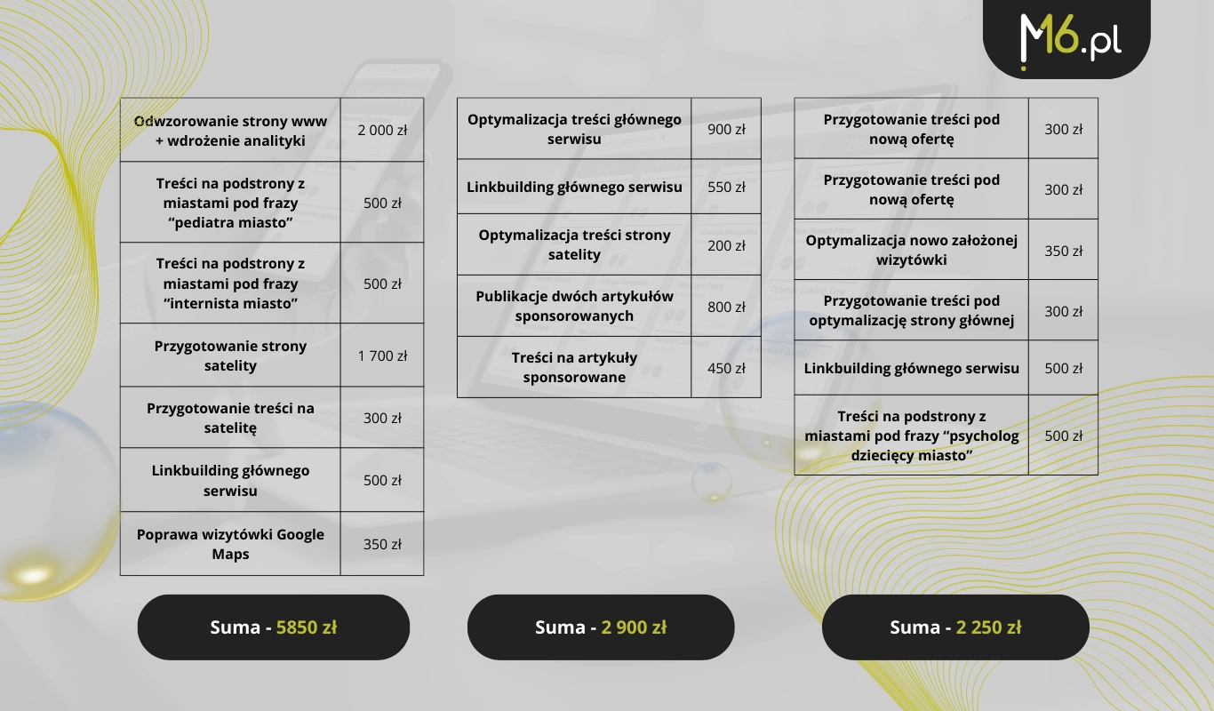 Pierwsze miesiące współpracy zawsze wiążą się ze wzmożoną ilością prac na stronie. Z tego względu ustaliliśmy, że na start mamy do zadysponowania 10 000 zł na trzy miesiące, żeby zacząć nasze działania z rozmachem. W tej kwocie rozliczyliśmy zarówno przygotowanie nowej strony, treści, a następnie późniejsze optymalizacje i linkowanie zewnętrzne.